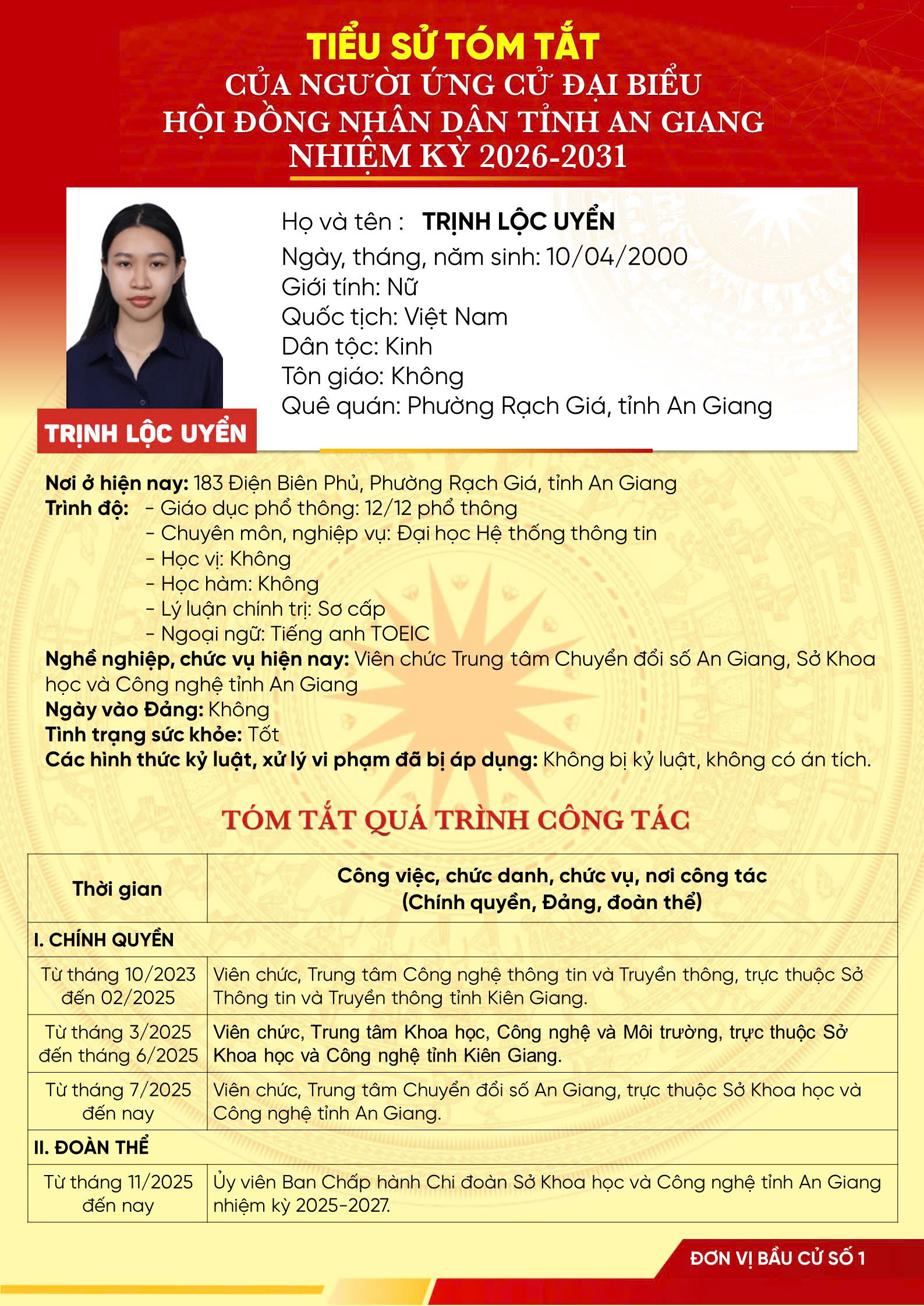 Tiểu sử tóm tắt của người ứng cử đại biểu Hội đồng nhân dân tỉnh An Giang nhiệm kỳ 2026 -2031 Ủy ban bầu cử tỉnh An Giang 05/03/2026 - aA + /tieu-su-tom-tat-cua-nguoi-ung-cu-dai-bieu-hoi-dong-nhan-dan-tinh-giang-nhiem-ky-2026-2031 Tin tức liên quan